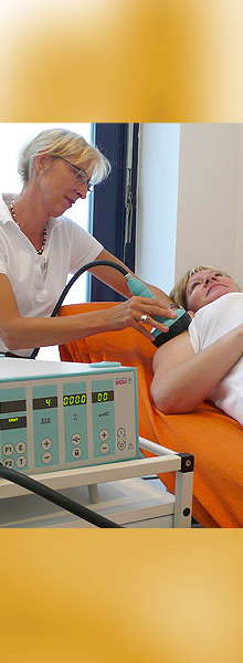 Die „Extrakorporale StoßWellenTherapie“ (ESWT) ist eine Behandlungsmethode alternativ zu operativen Eingriffen. Mit ihr gelingt es in 60 bis 85% der Fälle, die Schmerzen des Patienten zu lindern oder ganz zu beseitigen. Sie dient zur Behandlung von chronischen und punktförmigen Schmerzen, vornehmlich im Knochen-Sehnen-Übergangsbereich und im Muskelansatzbereich. Die Therapie wird durch kreisende Bewegungen eines Ultraschallkopfes am Schmerzpunkt durchgeführt. Vorteile: Keine Allergiegefahr, ambulante Therapie, schnell und schonend, nur 3 Therapieeinheiten und nach ca. 10 Tagen deutliche Schmerzlinderung spürbar.